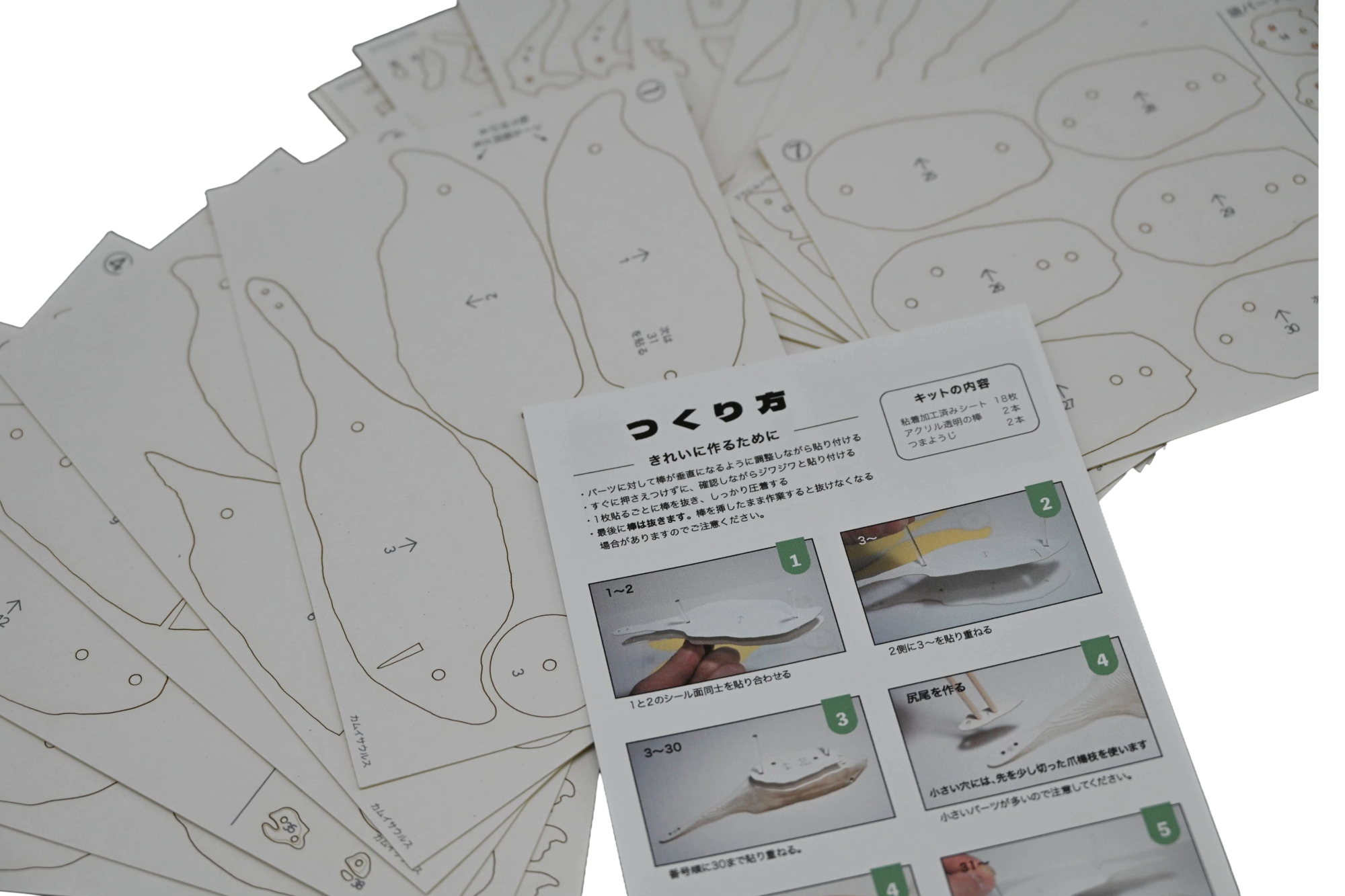 番号の書かれた厚紙シールを、一枚一枚丁寧に貼り重ねて立体的なカムイサウルスの姿を形作る、ユニークなペーパークラフトです。