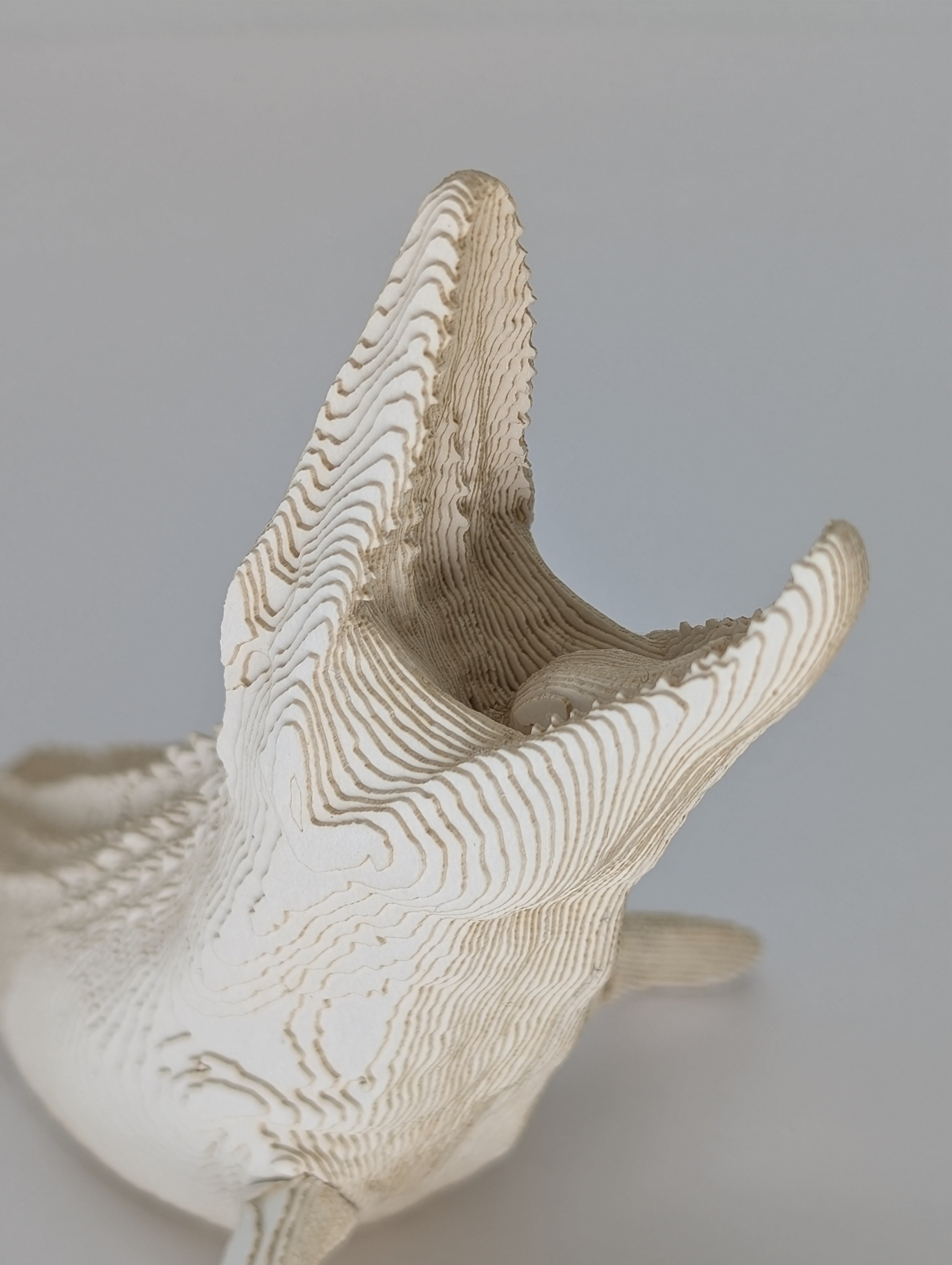 完成品は、層になった断面が地層や化石の重なりを思わせる、アート作品のような仕上がり。迫力あるモササウルスの頭部~体躯が立ち上がります。むかわ町で発掘された海の王者・モササウルスの迫力を、デスクやリビングで感じていただけます。