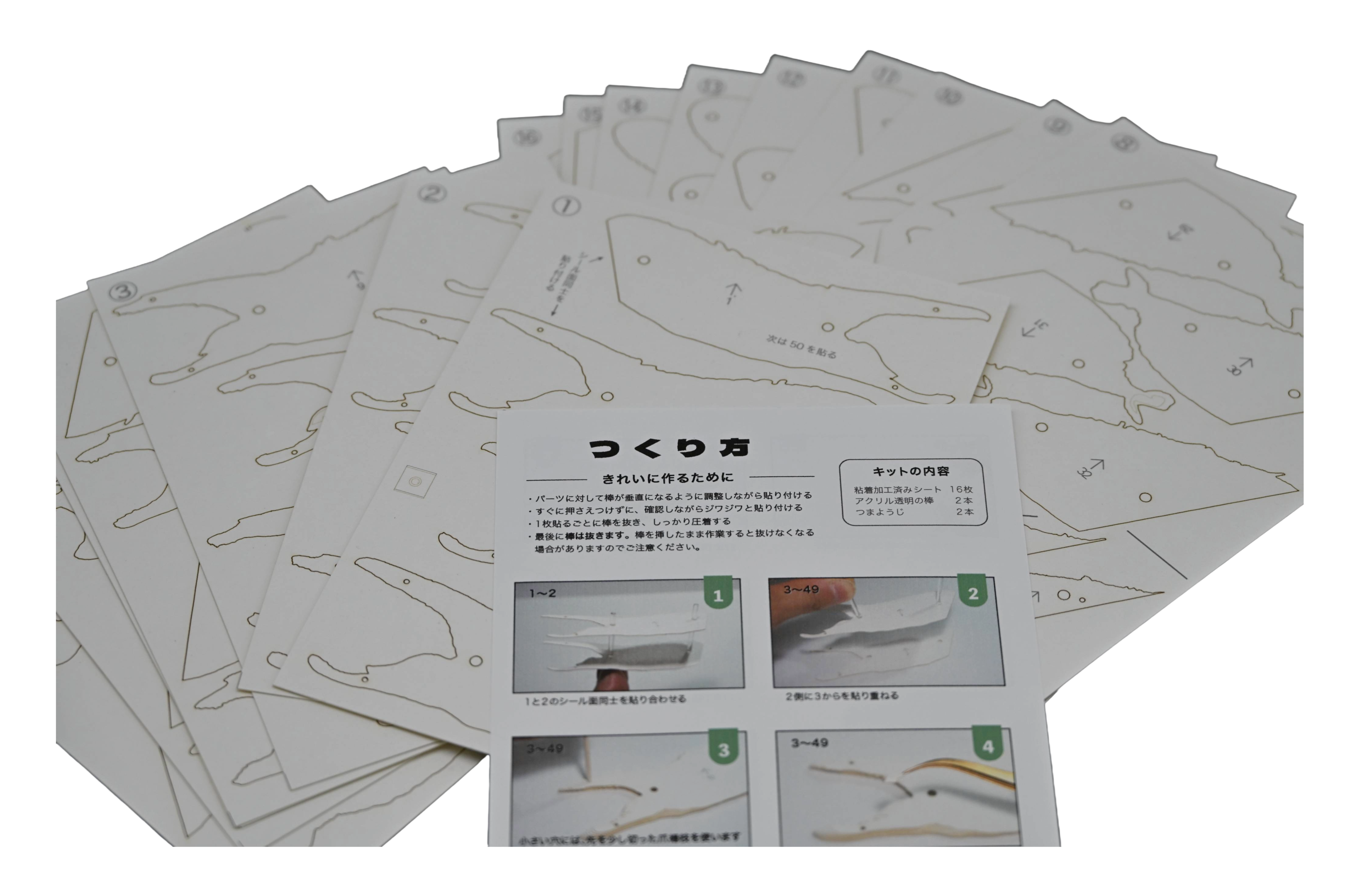 番号の書かれた厚紙シールを、一枚一枚丁寧に貼り重ねて立体的なモササウスの姿を形作る、ユニークなペーパークラフトです。